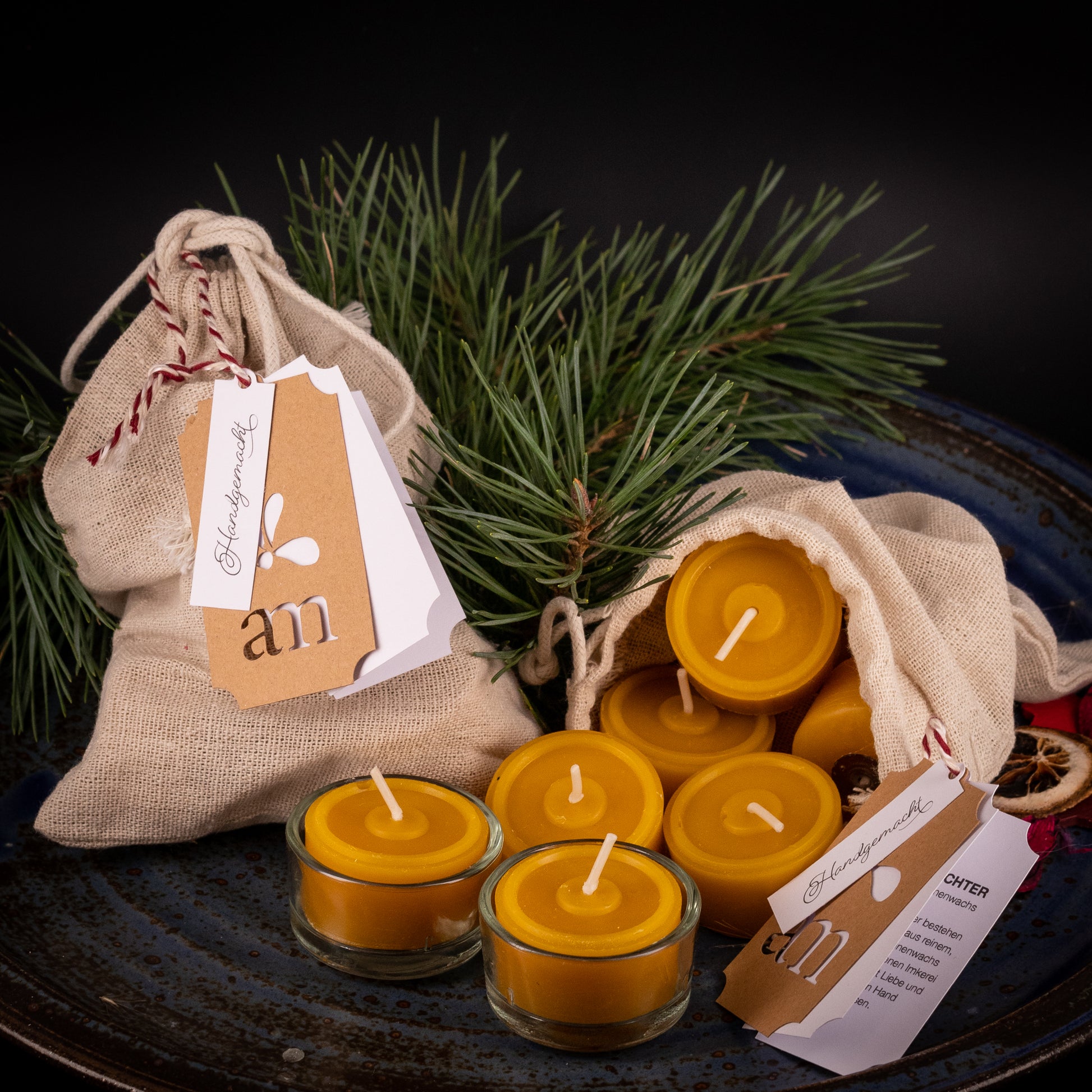Unsere Teelichter bestehen zu 100% aus reinem, natürlichen Bienenwachs aus unserer eigenen Imkerei. Unsere Kerzen werden mit Liebe und Sorgfalt von Hand gegossen.